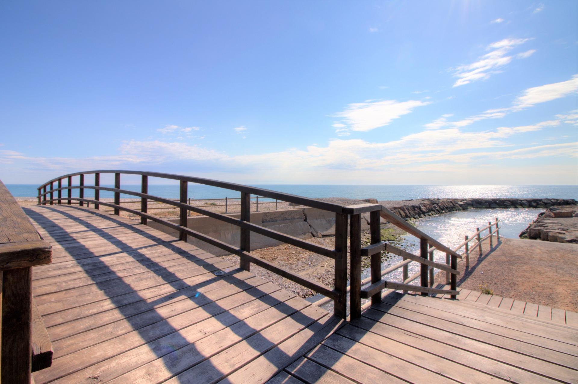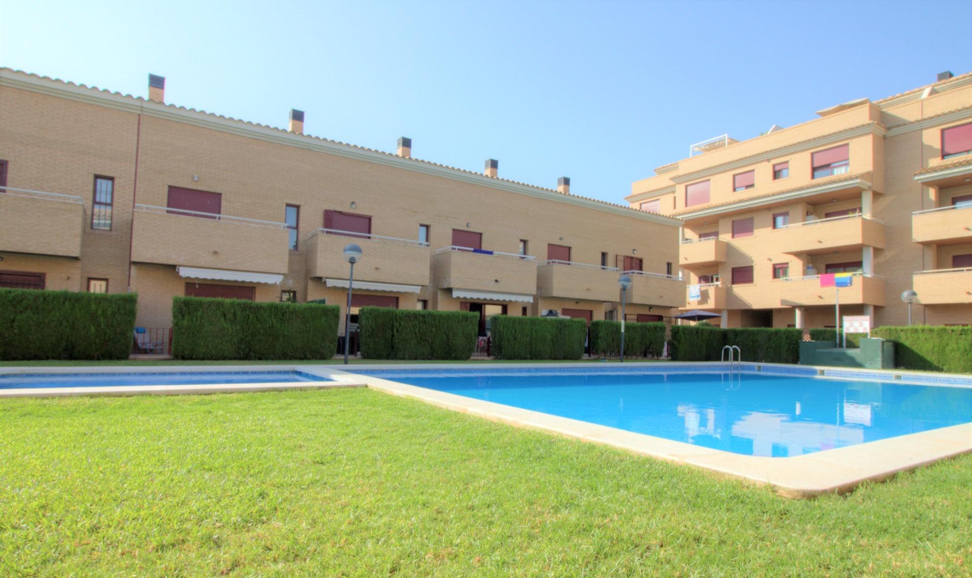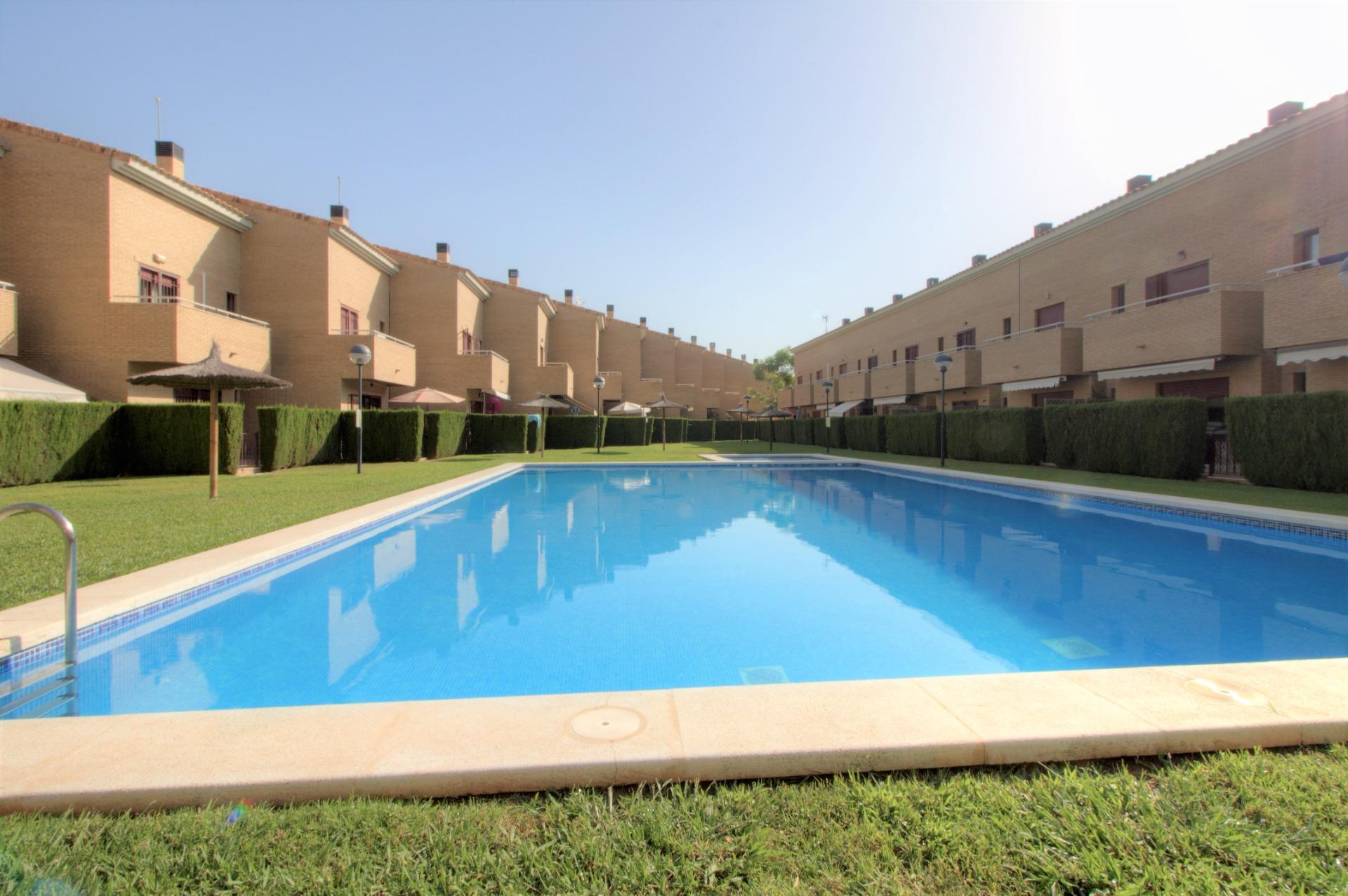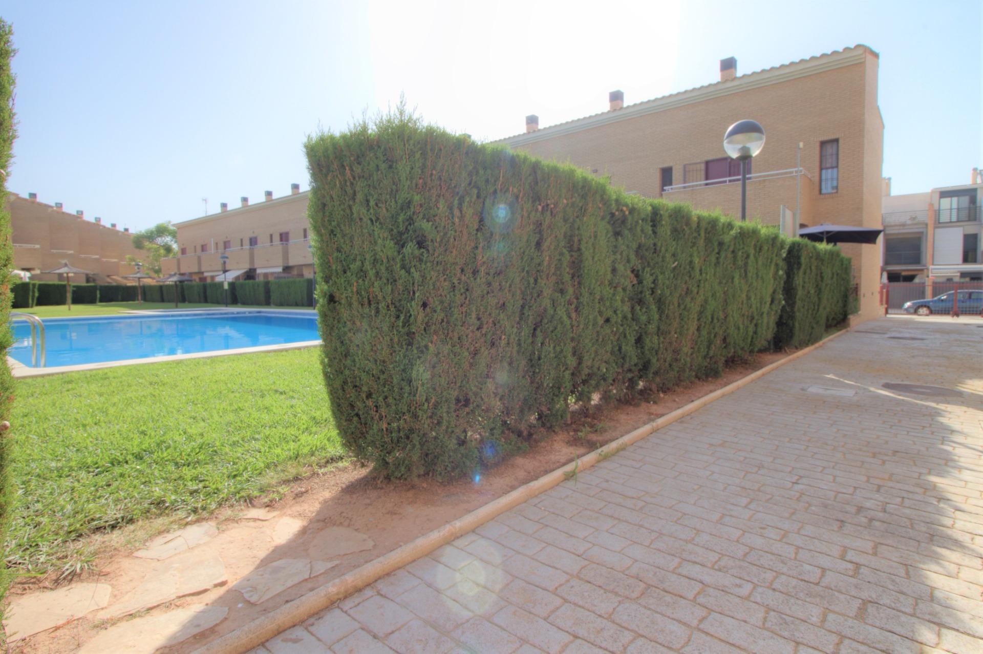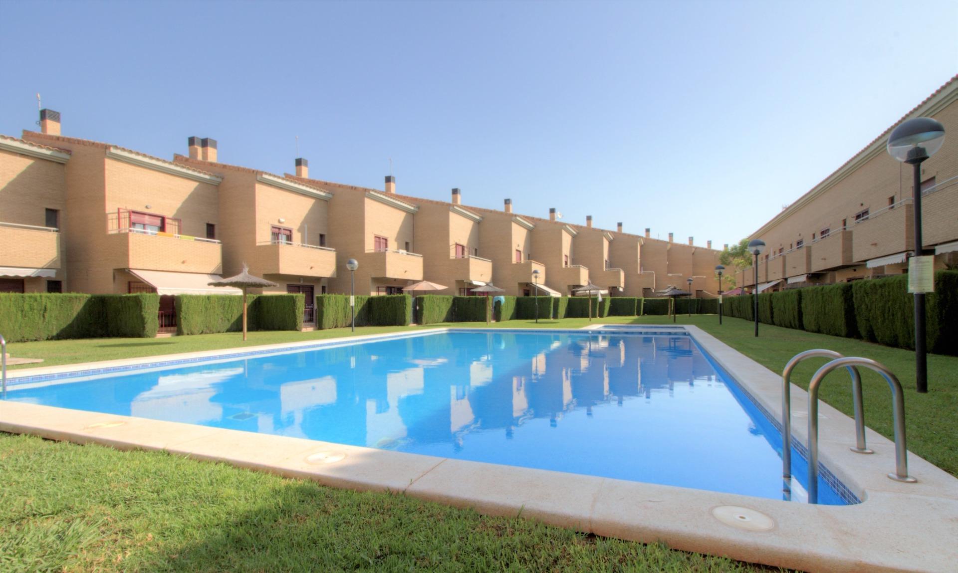Zonas comunes: Complejo Residencial Pont de l´Arena de nueva construcción, está formado principalmente de adosados. Ubicado en el casco antiguo de la playa, es ideal para veranear o vivir todo el año. La zonas comunes disponen de una gran piscina para adultos y otro más pequeña para los niños, alrededor de esta un inmenso jardín con césped natural donde extender su toalla y unas sombrillas fijas de coco natural. También tiene una zona de duchas para enjuagarse al llegar de la playa. Cada vivienda puede acceder directamente a las zonas comunes desde la terraza de la vivienda.